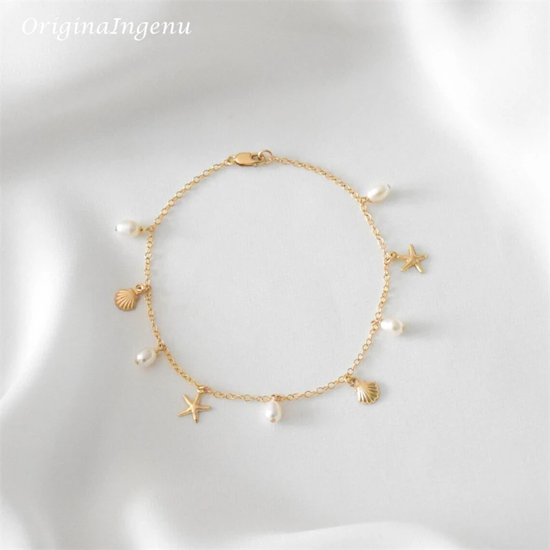 This 14K gold filled anklet features pearls and beach charms for a timeless yet playful style. Gold filled jewellery contains a thick layer of real gold bonded to brass, making it tarnish-resistant, durable, and hypoallergenic — perfect for daily wear. Includes free shipping to Singapore.