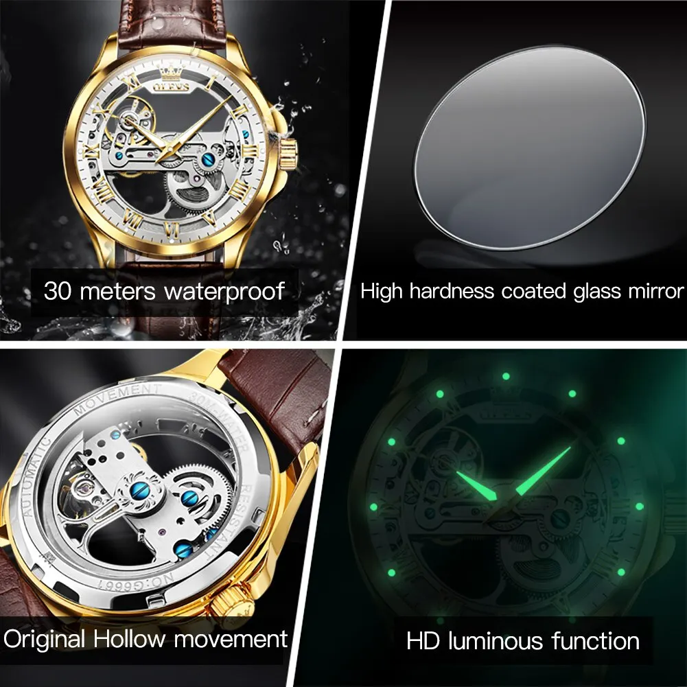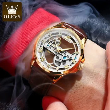 Refined and reliable, this OLEVS automatic skeleton watch pairs a leather strap with mechanical precision. Includes free shipping to Singapore.