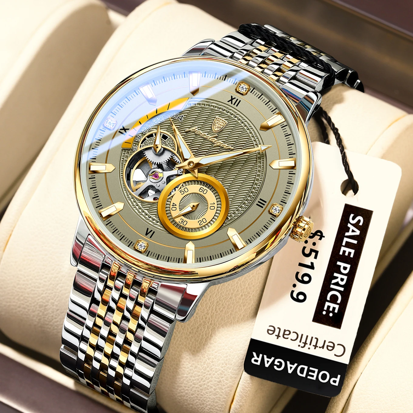 Discover refined craftsmanship with this POEDAGAR automatic watch. Its hollow tourbillon and luminous design bring sophistication to your wrist. Includes free shipping to Singapore.