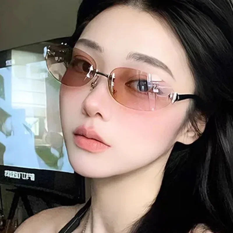 Turn heads with these Y2K-style elliptical sunglasses. Designed with a minimalist rimless frame and tinted lenses, they add instant edge to any outfit.